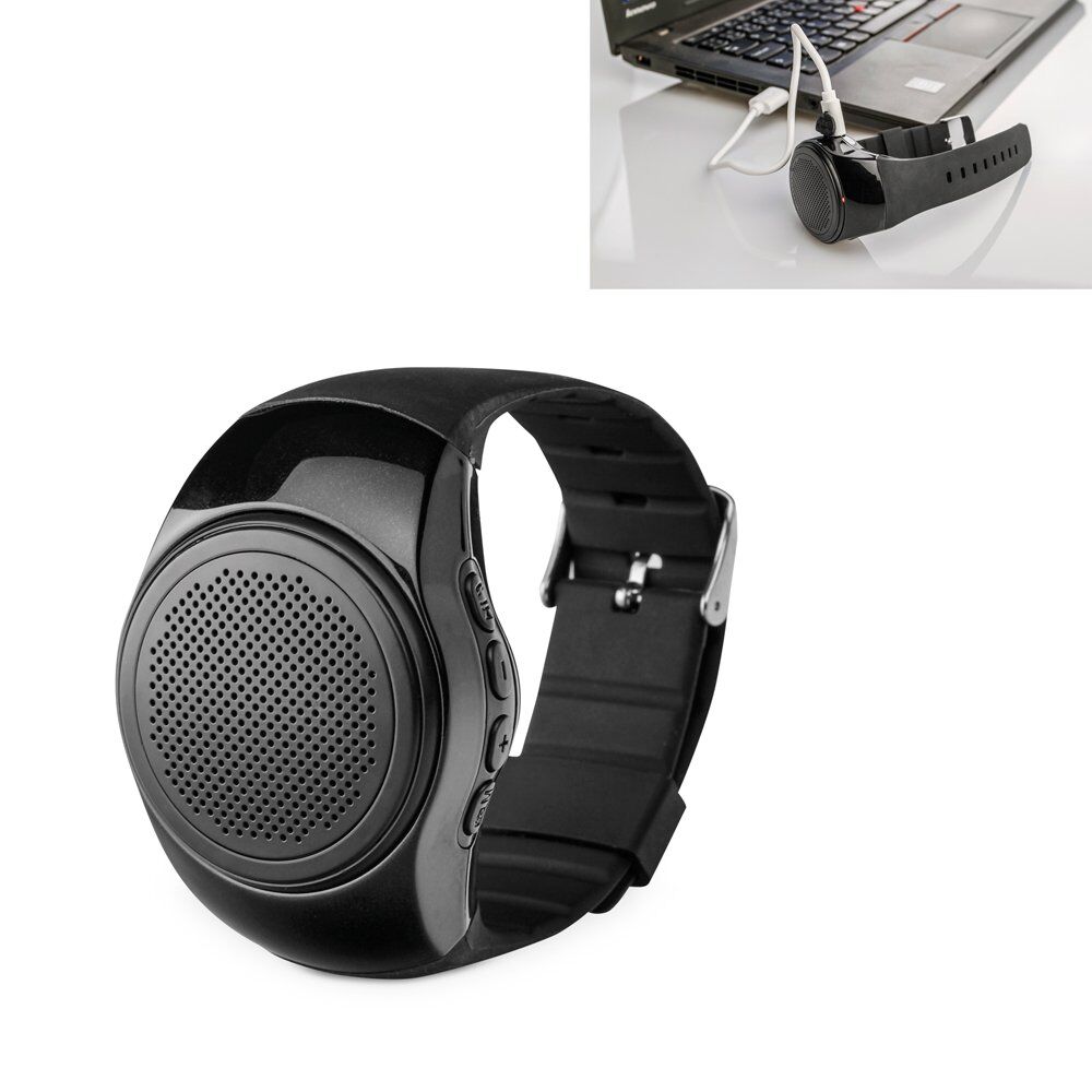 Wristwatch speaker with bluetooth transmission. The speaker has 3W of power, 2.1 bluetooth transmission up to 10m range, 250 mAh battery capacity, 3-4h charging time, up to 3 hours autonomy, built-in play/stop button and SD card slot . This promotional product is compatible with all devices that support bluetooth transmission. Includes USB/micro USB Cable. 47 x 24 x 70 mm